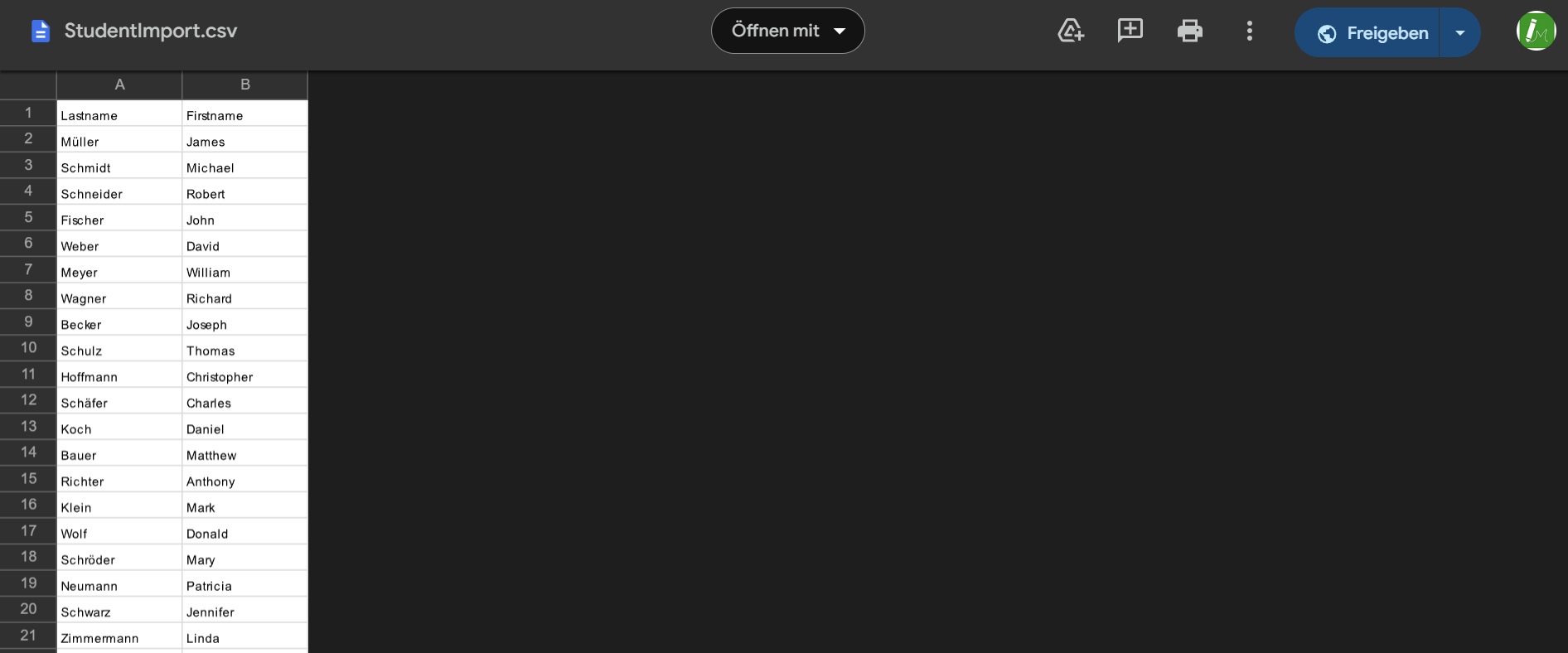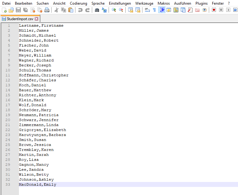 If no students are registered in a class yet, flixGRADE offers the option of importing a student list. This must be a text file with values ​​ separated by commas. CSV stands for "comma separated values". Spreadsheet programs such as Excel or OpenOffice offer this format when saving. However, you can also use a simple editor to create and adapt it. The file consists of two columns. The first line is "Lastname,Firstname". The other lines contain the student names. When creating the file, you must follow the template exactly.