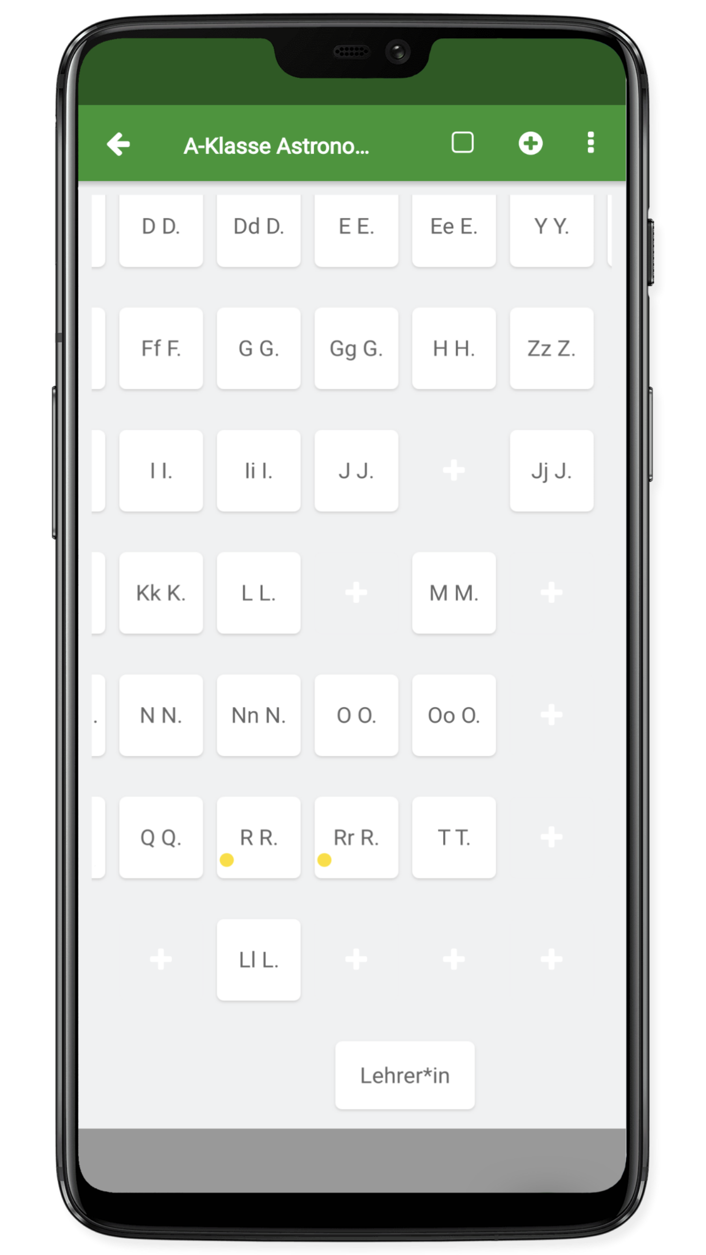Bei den Einstellungen zur Klasse können die Reihen und Spalten des Sitzplans festgelegt werden. Ein Sitzplan mit acht Reihen und acht Spalten bietet 64 Sitzplätze für Schüler. Auf einem Tablet kann diese vollständig angezeigt werden. Auf einem kleineren Smartphonedisplay muss man hier scrollen. Aber vielleicht kann man die Sitzordnung auch mit weniger Reihen und Spalten darstellen.